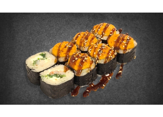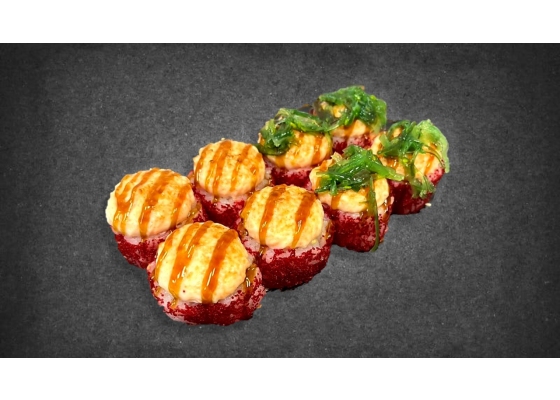 Состав: Сыр сливочный, Водоросли Чука, тобико, мидии, кунжут, соус яки.