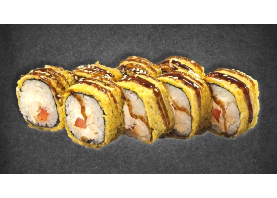 Состав: краб сурими + блин томаго, красный перец, соус унаги + соус васабито. жаренный кунжут.