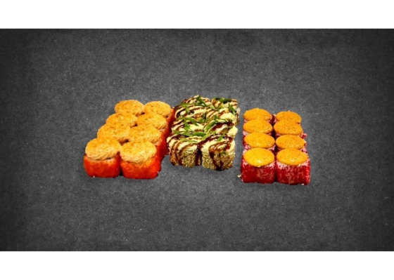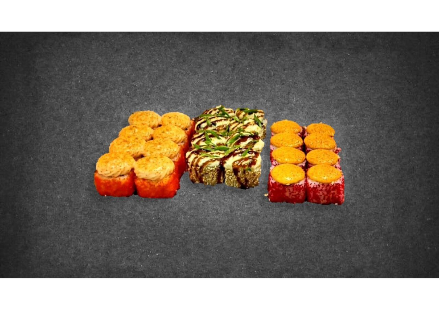 Состав: ролл с креветкой, ролл с угрем, ролл с лососем, ролл с тунцом, ролл с копченным лососем, ролл с беконом.