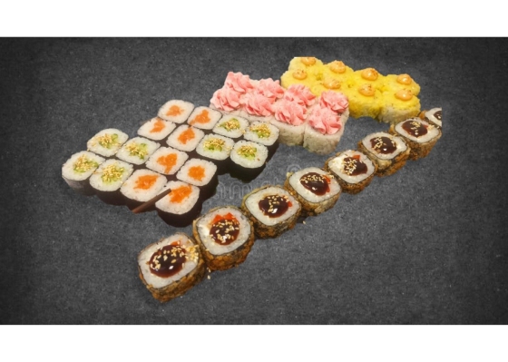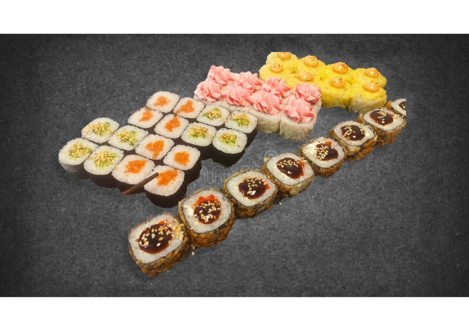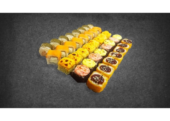 Состав: ролл с креветкой, ролл с угрем, ролл с лососем, ролл с тунцом, ролл с копченным лососем, ролл с беконом.