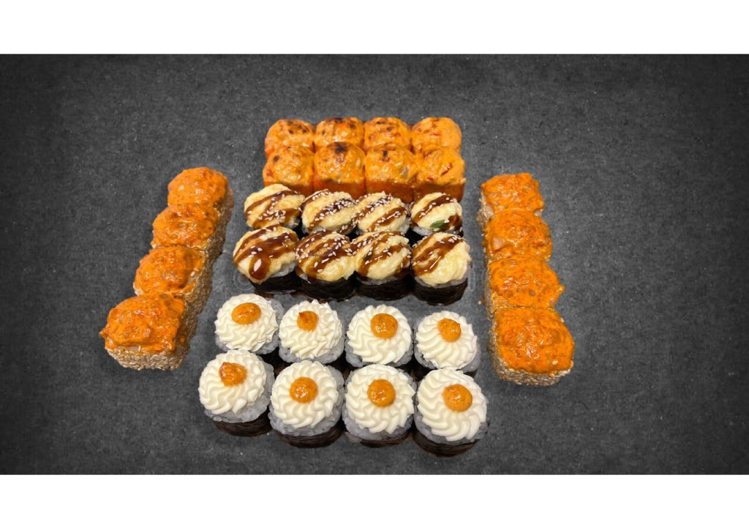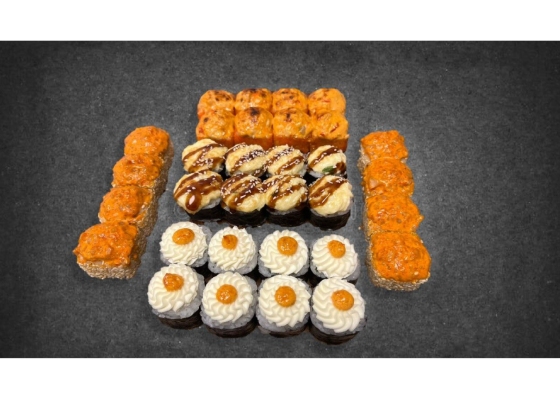 Состав: Запеченный с лососем, Вулкан, Запеченная тори, Запеченный таку.