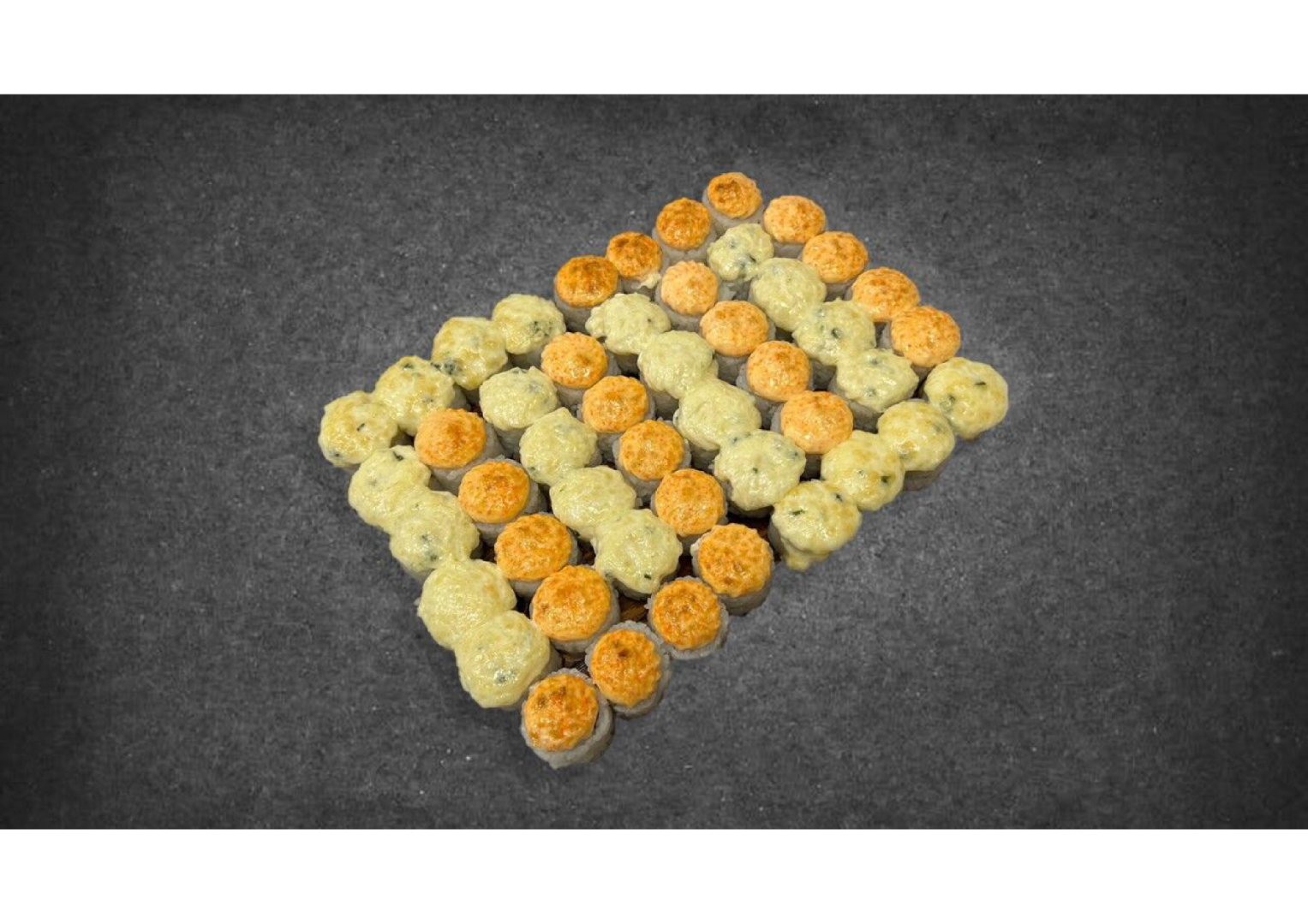 Состав: ролл с креветкой запеченный, ролл с лососем запеченный, ролл с угрем запеченный, ролл с тунцом запеченный, ролл с копченным лососем запеченный, ролл с беконом запеченный.