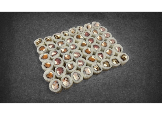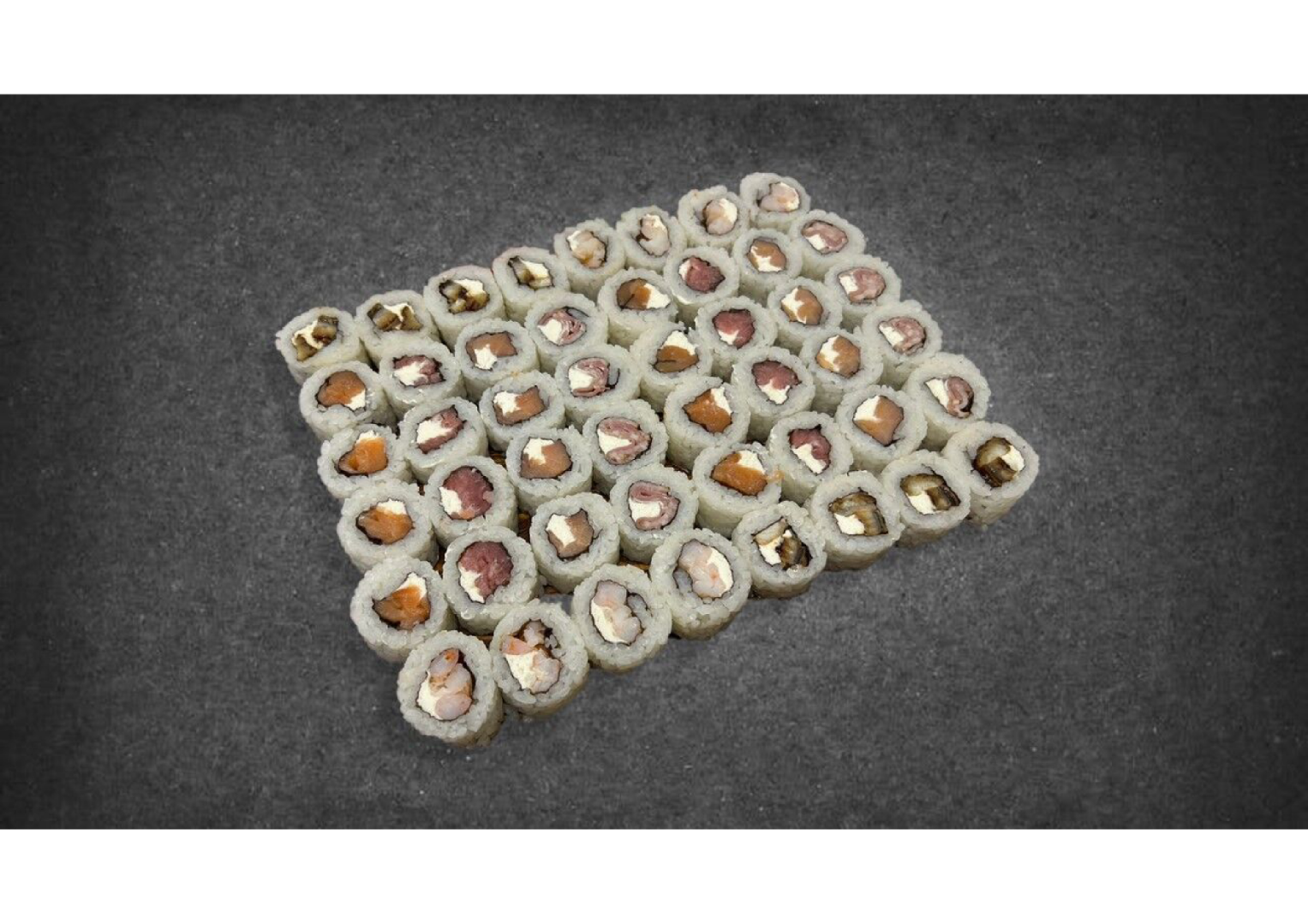 Состав: ролл с креветкой, ролл с угрем, ролл с лососем, ролл с тунцом, ролл с копченным лососем, ролл с беконом.