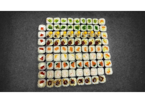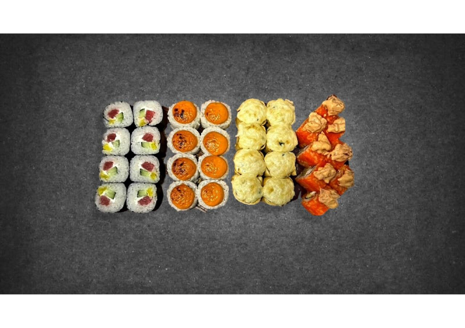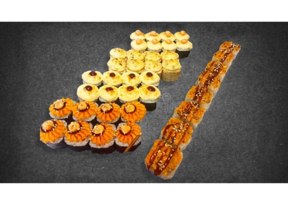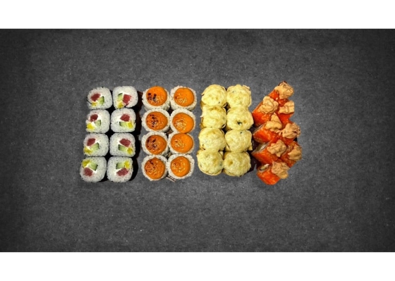 Состав сета: Сяке маки, Эби маки, Каёси маки, Каппа маки, Томато маки, Чукка маки, Сяке кунсей маки, Тори маки, Унаги маки, Кани маки, Apple маки.