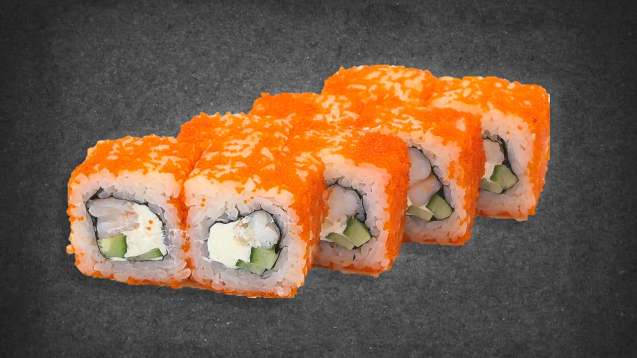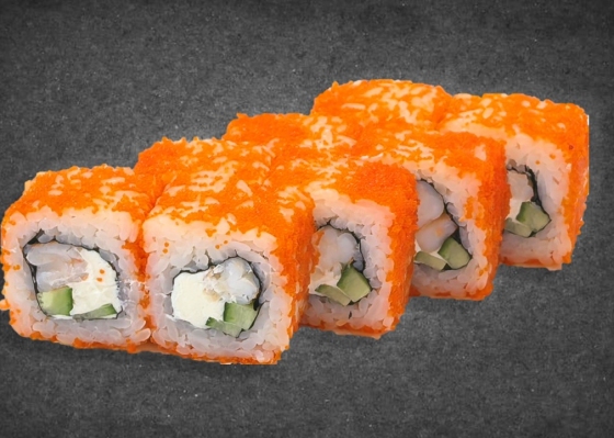 Состав: сливочный сыр, королевская креветка, огурец, икра летучей рыбы.