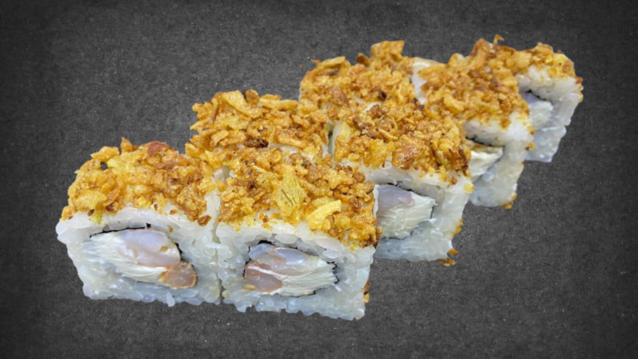 Состав: сыр сливочный, соус Спайс, креветки тигровые, жареный лук.