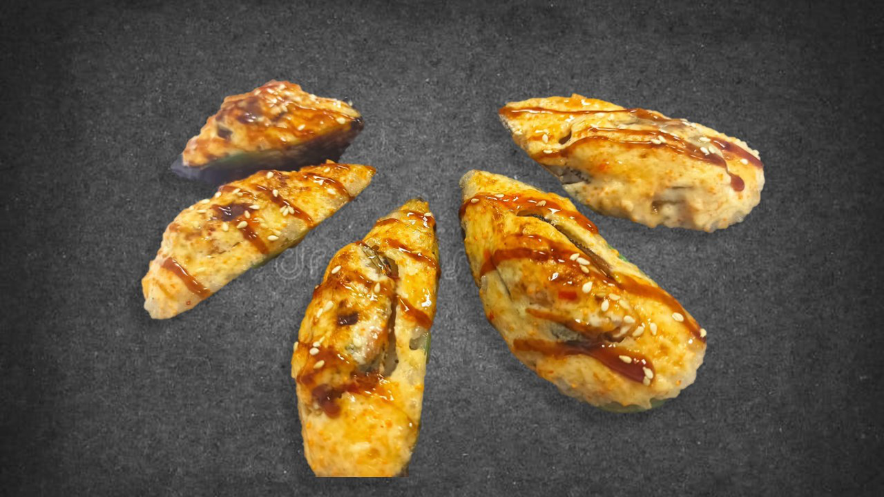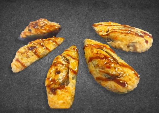 Состав: запеченные норвежские зеленые мидии, под яки соусом на рисе, унаги соус.