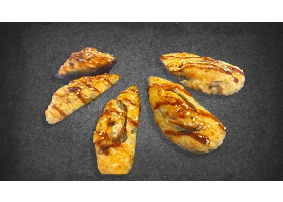 Состав: запеченные норвежские зеленые мидии, под яки соусом на рисе, унаги соус.