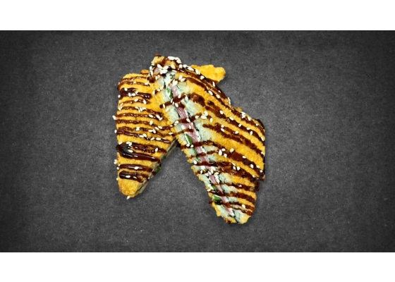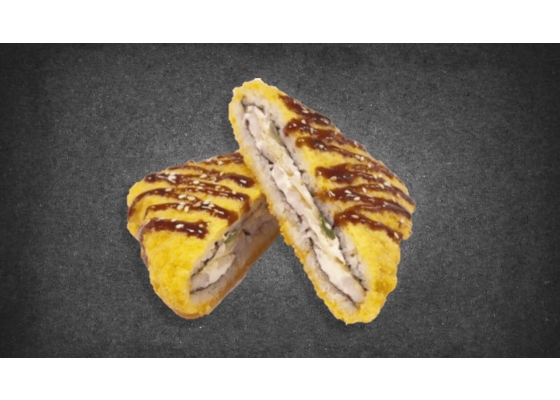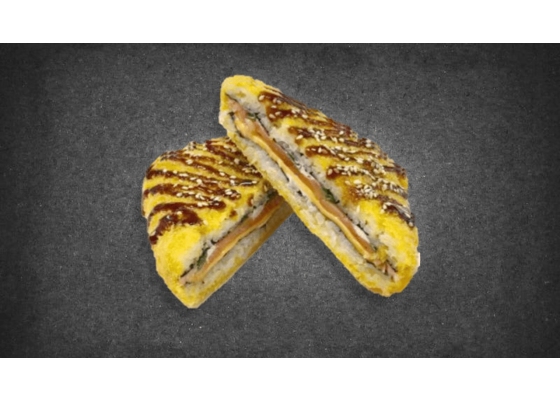 Состав : рис, сыр сливочный, цыпленок унаги, сырный соус, зеленый лук, соус унаги, кунжут.