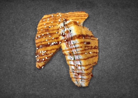 Состав: рис, сыр сливочный, бекон, томат, огурец, соус унаги, кунжут.