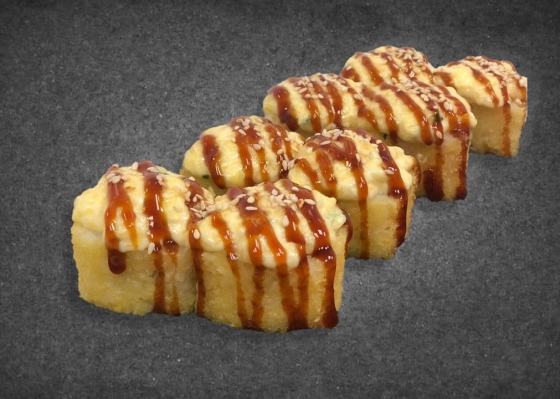 Состав: сливочный сыр, мидии спайс, огурец, сухари панко, соус унаги, кунжут.