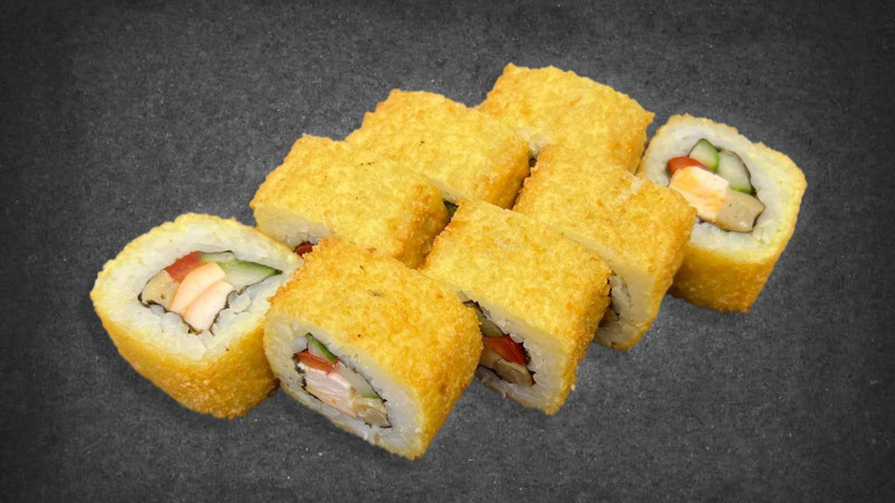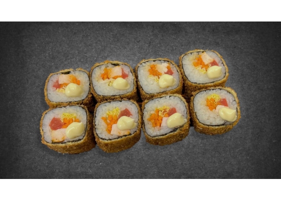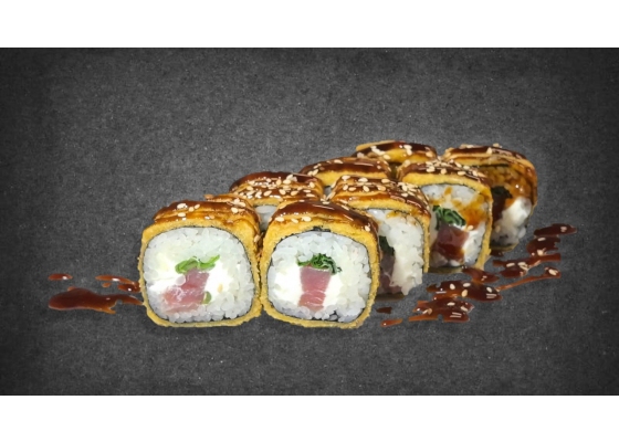Состав: филе тунца, сыр сливочный, зеленый лук, сухари Панко, соус терияки.