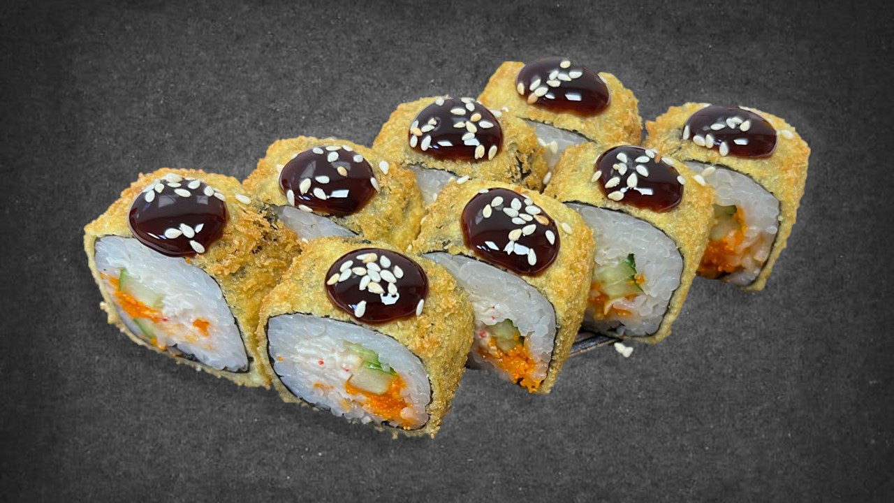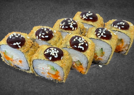 Состав: снежный краб, огурец, масаго, соус унаги, кунжут.