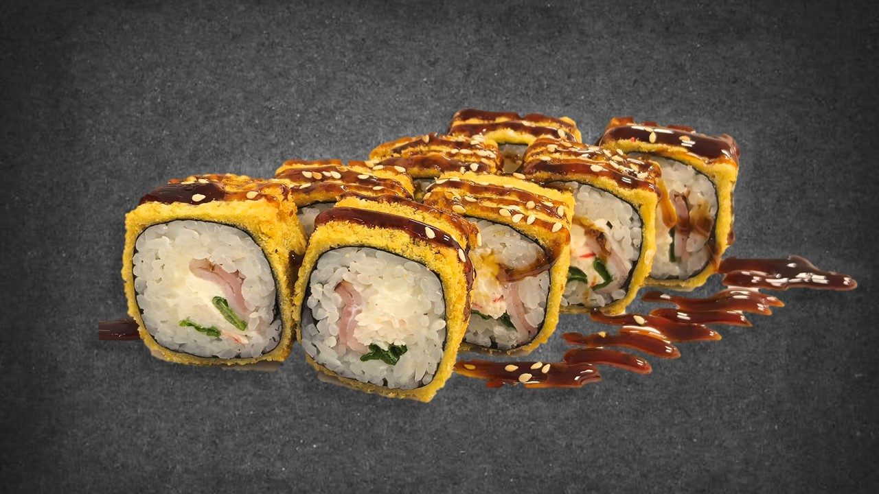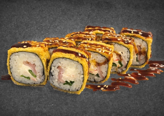Состав: сливочный сыр, мидии спайс, огурец, сухари панко, соус унаги, кунжут.