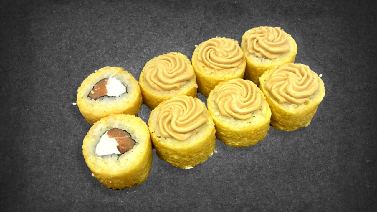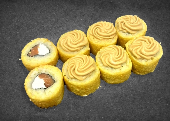 Состав: нори, рис, сливочный сыр, лосось, соус брюле.