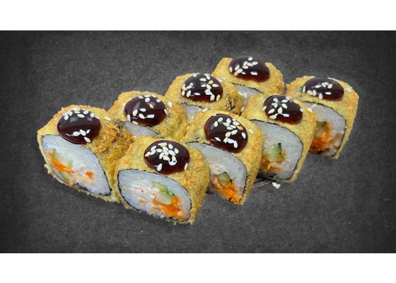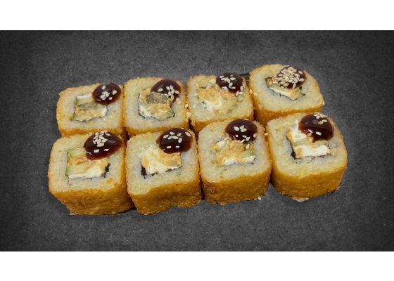 Состав: сливочный сыр, мидии спайс, огурец, сухари панко, соус унаги, кунжут.