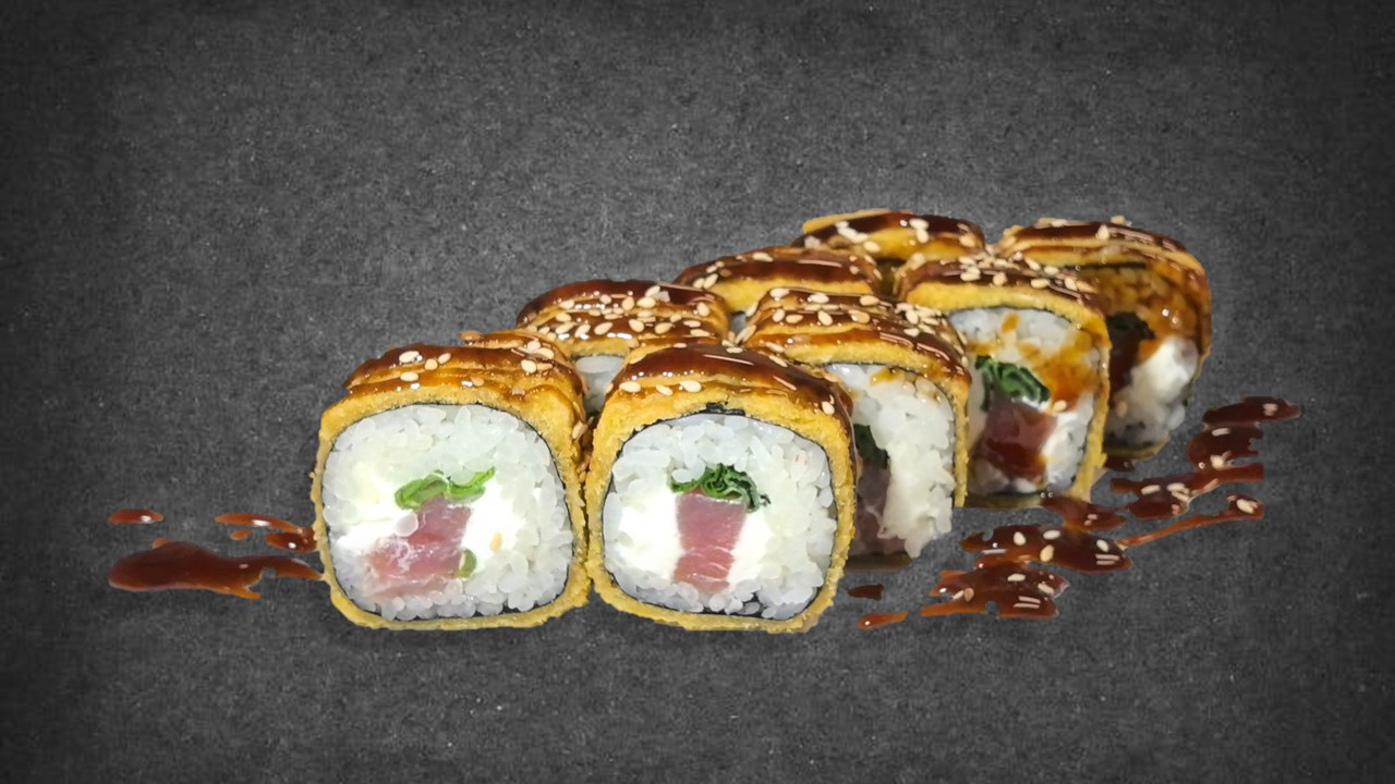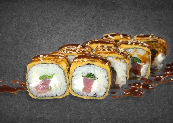 Состав: филе тунца, сыр сливочный, зеленый лук, сухари Панко, соус терияки.