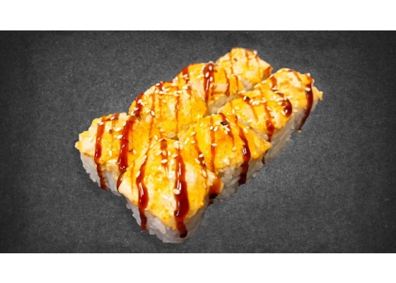 Ролл BBQ: сыр сливочный, сыр плавленный, жареный бекон, соус пряный. Жаренный+ запеченный ролл.